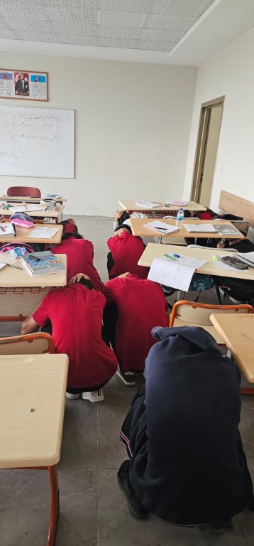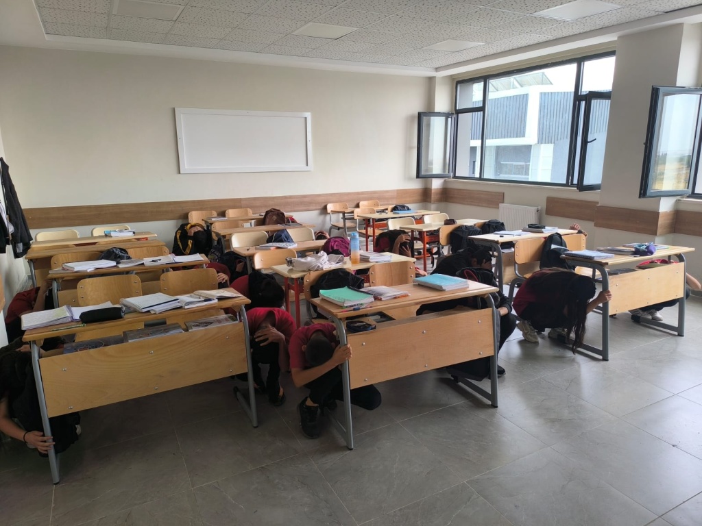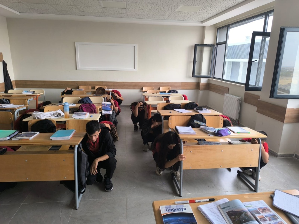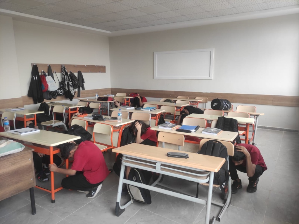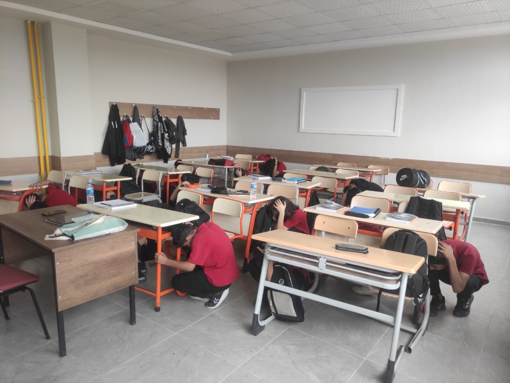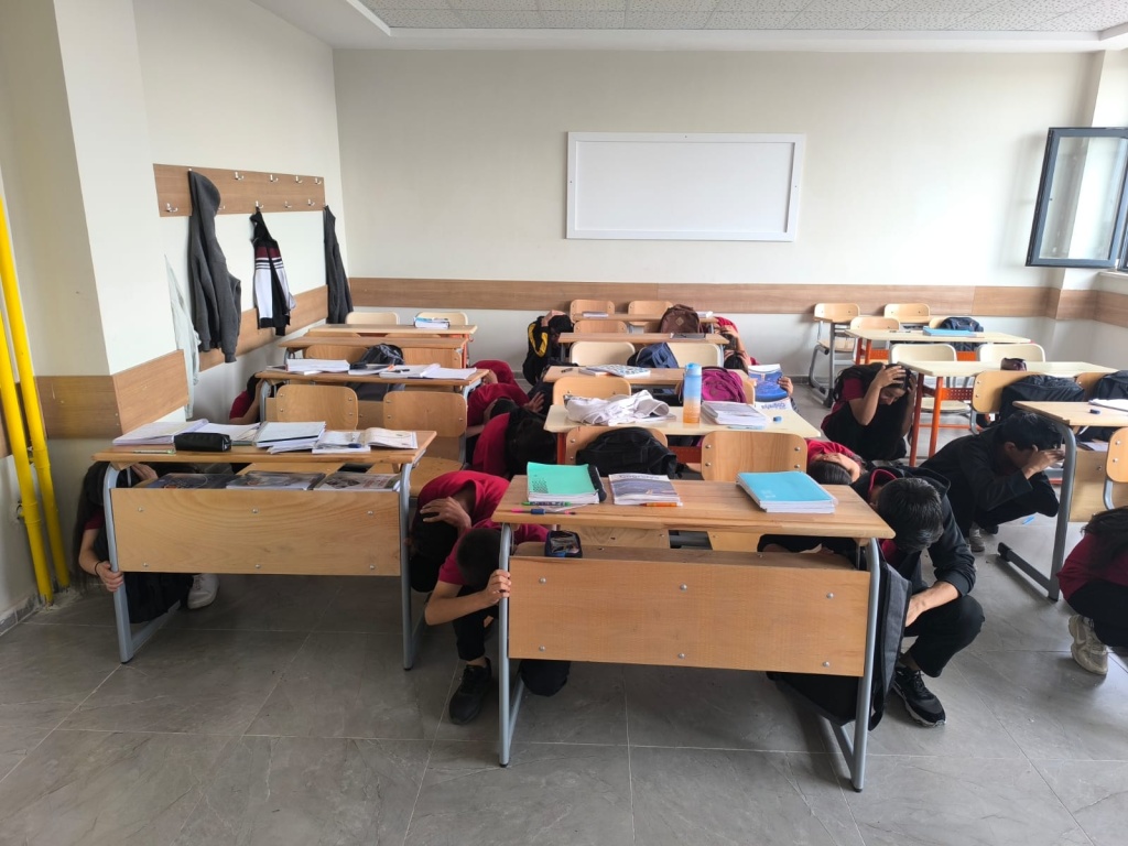 6 Şubat 2023’te yaşanan ve bölgemizi de etkileyen büyük depremler, afetlere karşı bilinçli olmanın önemini bir kez daha gösterdi. Bu bilinçle düzenlenen tatbikatta, siren sesiyle birlikte öğrenciler “çök-kapan-tutun” yöntemiyle kendilerini korudu ve ardından güvenli bir şekilde tahliye edildi.